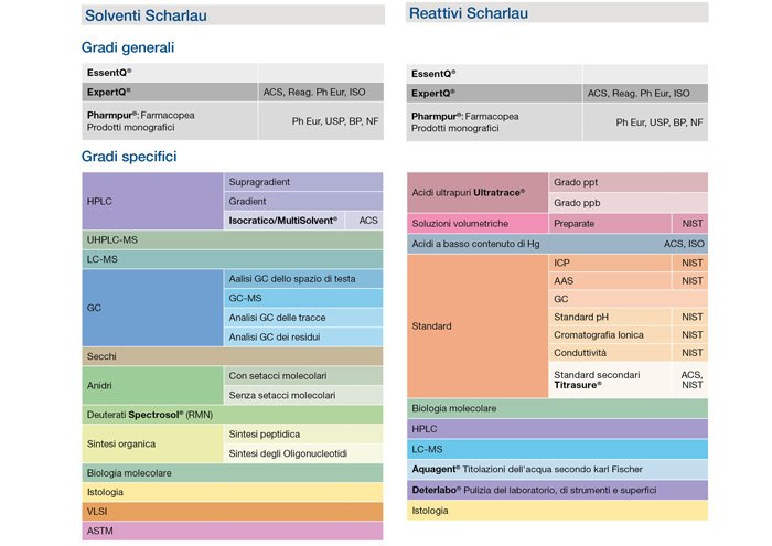 • ExpertQ®: Qualità utilizzata principalmente nel lavoro analitico di laboratorio. Corrisponde ad un grado di reagenti di alta qualità per laboratori e per uso industriale specializzato. La qualità ExpertQ® include solventi, sali, acidi e basi, soluzioni e misceles.